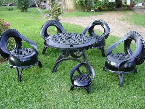 Os pneus também são usados para montagem de móveis artesanais, como mesinhas e banquinhos, que podem ser colocados em diferentes locais no jardim.