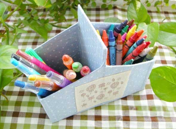 Também é possível fazer um porta objetos com caixas de leite, que podem ser enfeitados com tecido, papel contact, EVA, ou outros materiais.