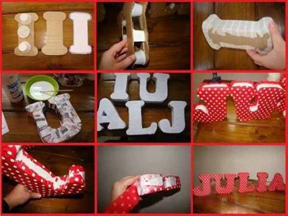 Para fazer letras decorativas aí na sua casa vocês podem usar diversos materiais, dentre eles papelão, isopor e feltro, que podem ser usados para fazer a base das letras, e que depois podem ser enfeitados com o uso de diversas técnicas manuais.